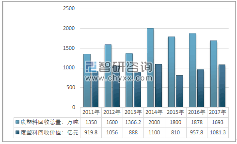 2017年中国塑料行业受环保及供给侧结构性改革等因素影响,塑料产品订单向大中型企业转移,小规模尤其家庭作坊式生产企业数量明显下降。2017年国内废塑料回收量为1693万吨,较2016年的1878万吨下降了185万吨,降幅为9.9%。但得益于废塑料市场供不应求现状,废塑料价格持续走高,国内废塑料回收总值1081亿元,较2016年仍有12.9%增幅,同时废塑料行业整体盈利水平较2016年有所提高,部分产品盈利提高50%-60%。