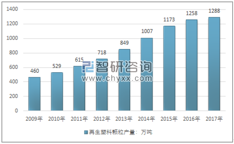 智研咨询发布的《2019-2025年中国废塑料回收行业市场运营模式分析及发展趋势预测研究报告》数据显示:近几年,我国再生塑料颗粒行业产量快速增长,从2009年的460万吨增长到2017年的1288万吨,近几年我国再生塑料颗粒行业产量情况如下图所示: